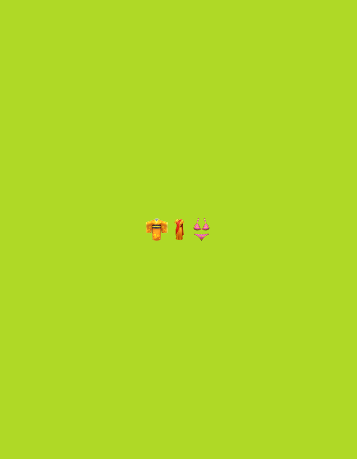 The scene displays three distinct emoji graphics centrally positioned on a solid lime green background. There are no discernible physical features to indicate a specific location within the city of Pulorayeuk, Indonesia; the environment is a uniform digital canvas. From left to right, the subjects depicted are: a yellow-orange top with floral patterns, resembling a kimono jacket; a reddish-orange figure, interpreted as a person wearing a sari; and a pink two-piece bikini with small patterned details. No individuals are present, and no actions or interactions are depicted.