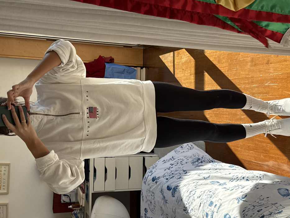 A person is depicted from the upper torso to the feet, reflected in a mirror within an indoor setting. The individual holds a dark smartphone, obscuring their face, with a ring visible on the left ring finger. They wear a white long-sleeved quarter-zip sweatshirt featuring a partially unzipped collar. The sweatshirt displays a reversed embroidered American flag beneath reversed text that reads "LOS ANGELES" and "1984." Black leggings, white crew socks with a black Nike swoosh on each, and white athletic shoes complete the attire. The setting appears to be a sunlit room, possibly a bedroom, with warm light entering from the left and casting strong shadows on a light-toned wooden floor. To the left of the reflected person, a bed covered with white bedding featuring a blue patterned design is visible. Adjacent to the bed is a white five-drawer chest or desk, holding a clear bottle with a pump and a dark rectangular object. Above this furniture, a framed item with reversed text (e.g., "NEW YORK," "TOKYO") hangs on a light-colored wall. To the right, a blue bag, red fabric, and a vertical strip of multicolored fabric (predominantly red and green) are partially visible against a light wall or door frame. The specific location within Vila Nova de Gaia, Portugal, is not discernible from the image.