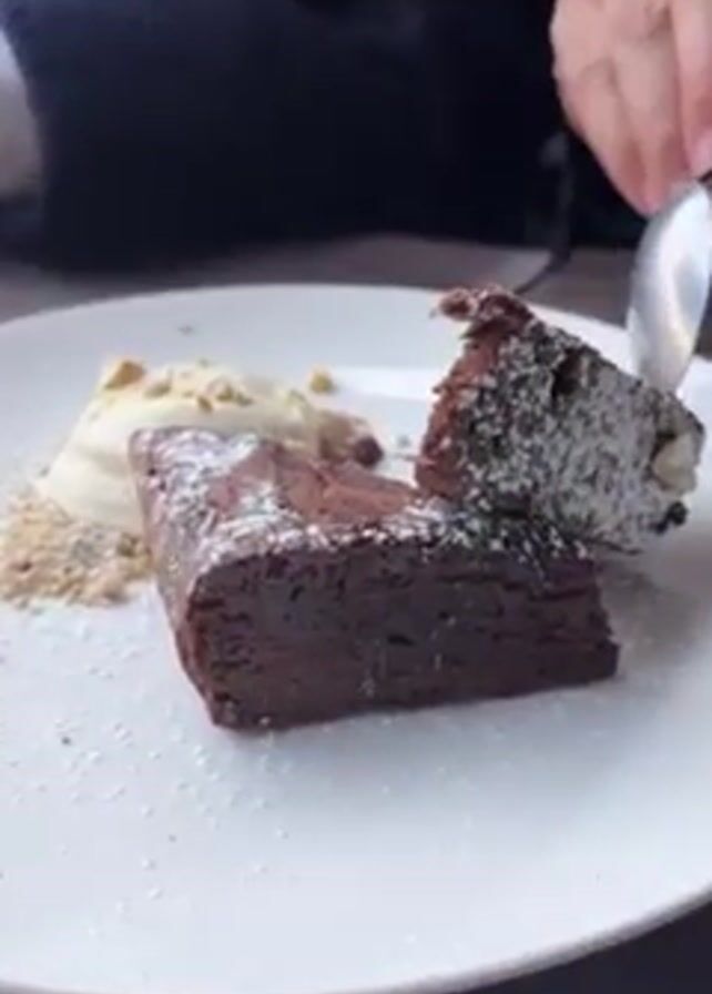 close-up of a dessert being split with a spoon. The dessert is a dark brown chocolate brownie, square-shaped, dusted with powdered sugar. Next to it is a scoop of white ice cream, sprinkled with crushed nuts. A person wearing a black jacket and a white-sleeved shirt is holding the spoon. The dessert is on a white plate, set on a brown, textured surface. The focus remains on the brownie being divided.