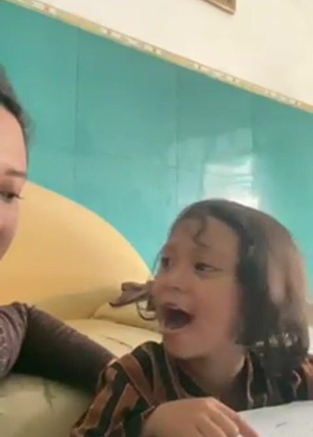 A young child with dark hair and wearing a striped shirt is seated at a table with a woman, likely a parent, beside her