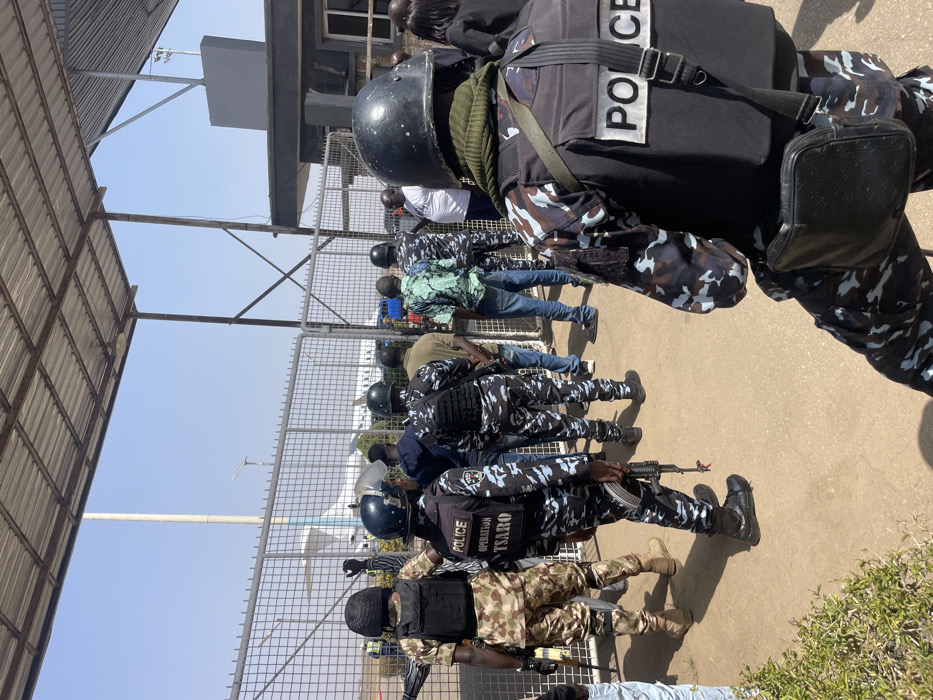 An outdoor scene at an airport entrance in Kwi, Nigeria, under a clear blue sky. A group of approximately twelve individuals, including armed security personnel and civilians, stands on a dirt path beneath a corrugated metal canopy structure. In the foreground, an individual in a blue camouflage uniform, dark ballistic vest with "POLICE" visible on the back, and a dark helmet with a green knit snood is seen from behind, slightly crouched. To their left, another officer in blue camouflage with "POLICE OPERATION TSARO" on their vest holds an AK-style assault rifle. Further left, an individual in brown/green military-style camouflage, a dark vest, and a helmet, also armed with an assault rifle, faces a metal chain-link fence. Several other individuals in similar blue camouflage police uniforms and helmets are visible, some standing among civilians. The civilians, mostly men, are dressed in various casual clothing including jeans, a white shirt, and a green patterned shirt, standing near the security personnel and facing the fence. Beyond the tall, galvanized chain-link fence, which is topped with what appears to be barbed or razor wire, a large white aircraft (consistent with a private jet or small passenger plane) is parked on an airfield under clear skies. To the right of the aircraft and beyond the fence, a small building or guard post with a dark roof is visible.