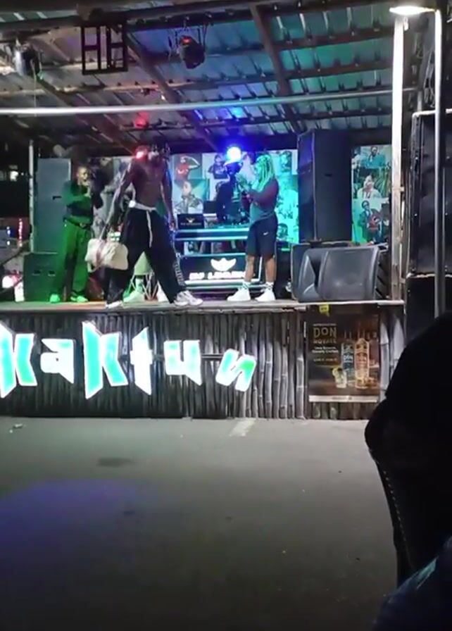 Here’s a detailed description of the video: The video captures an outdoor stage at night, where several people are performing. The stage, built with bamboo fencing, has the word "KAKTUS" illuminated in white lights across the front. There are three people visible on stage. One man, shirtless and wearing dark pants, is dancing energetically. Another man, wearing a green sweatshirt and khaki shorts, stands near a DJ setup. A third person in a green outfit stands on the left side of the stage. Stage lighting includes colored spotlights that illuminate the performers and back of the stage which has pictures of people on it. Two large speakers flank the stage. The viewing angle is from the side, and an empty chair is visible in the foreground. The atmosphere is lively and energetic, suggestive of a musical performance.