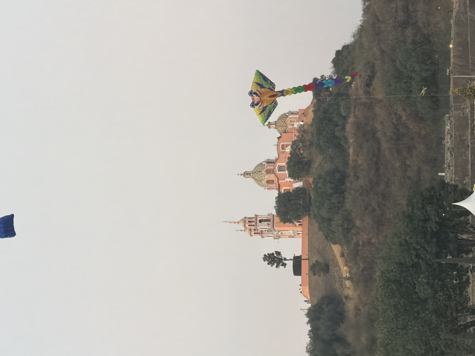 A vibrant kite shaped like a manta ray soars above a building complex. The buildings, painted in orange and cream, feature ornate domes and towers. A lush, green hillside rises behind the structures. In the lower left, a smaller, blue kite adds another splash of color to the sky. The backdrop is a muted, overcast sky.