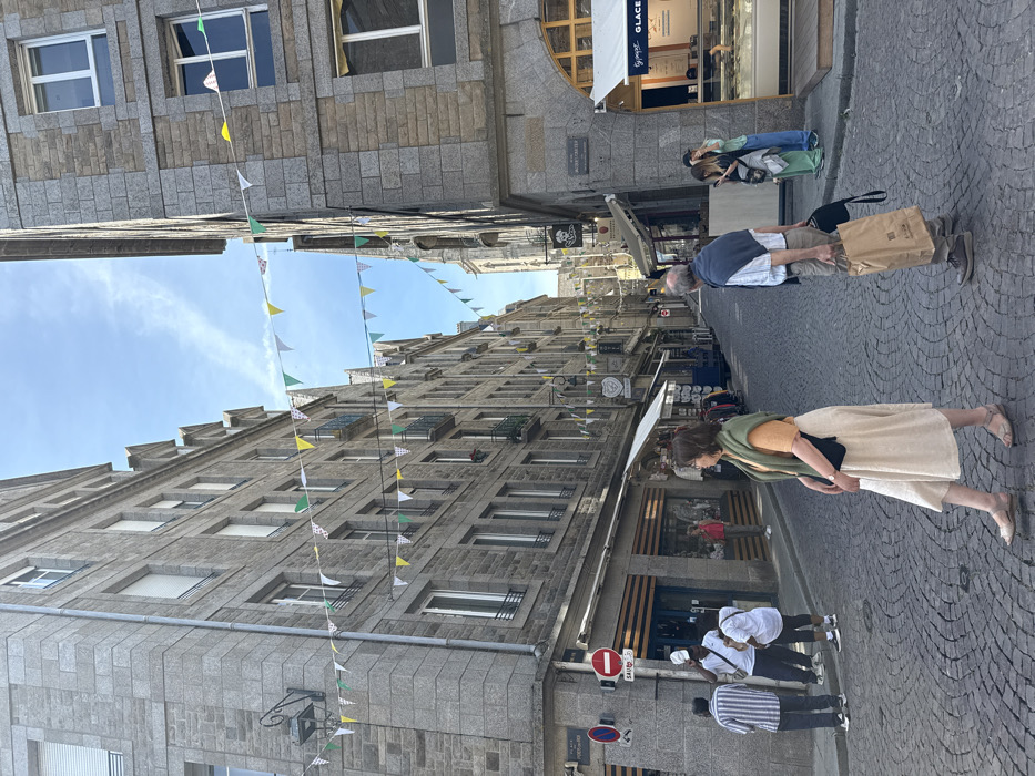 A street scene with tall gray buildings lining both sides, connected by colorful bunting strung across the street