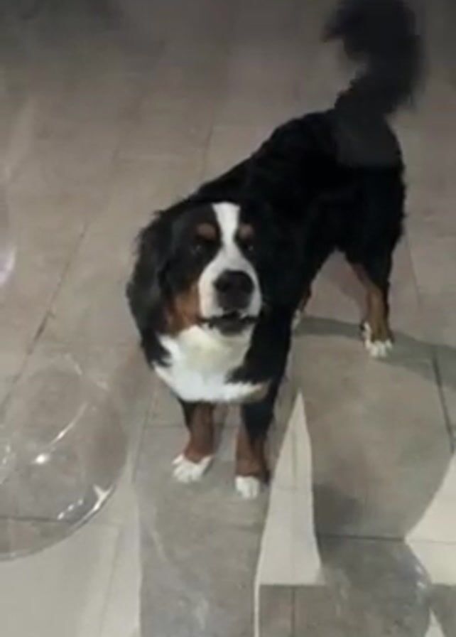 The video features a Bernese Mountain Dog standing on a tiled surface