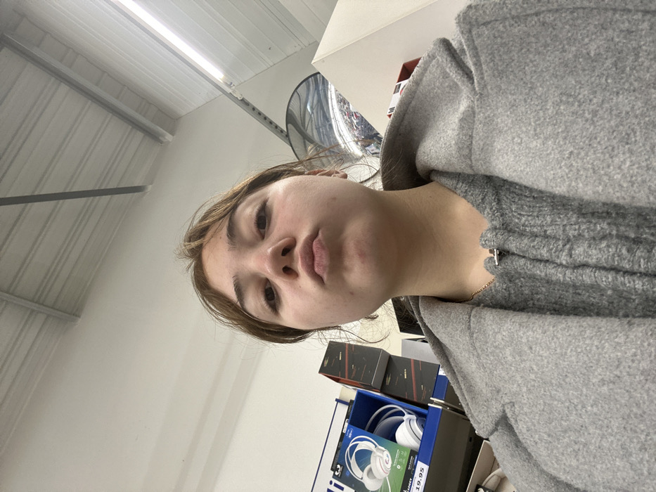 A young woman looks down at the camera with a pout. She has light brown hair and is wearing a gray jacket. Behind her, there is a ceiling with fluorescent lights, a cooling fan, and shelves stocked with headphones. Some of the headphones are visible in their packaging. The image is slightly tilted.