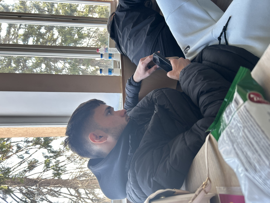 The image depicts an indoor scene in Dolni Dabnik, Bulgaria, looking outwards through large windows. In the immediate foreground, a light-colored shoulder bag and a partially open bag of snacks with green packaging rest on a light-colored surface, likely a table. To the left, a male subject with short, dark hair, faded sides, and light facial hair is seated, looking down intently at a dark-colored smartphone held in his hands. He is wearing a black hooded puffer jacket over a black hoodie. His left arm rests on a light brown surface or armrest. To the right, partially obscured by the first subject and a white window frame, another person is visible from the back, wearing a black jacket and light-colored (possibly white or light gray) sweatpants with a black Nike swoosh logo on the thigh. This person's head is not visible, and they appear to be leaning away from the camera. On the white window ledge behind the subjects, two plastic bottles are visible: one white with a blue cap and label, and one clear plastic bottle with a blue cap, labeled "Devin" in red text. A third, clear plastic bottle with a pink cap is partially visible behind the Devin bottle. Through the multi-paned windows, bare tree branches are visible against a bright, clear sky, indicating an outdoor environment, possibly a park or natural area. The interior space is well-lit by natural light.