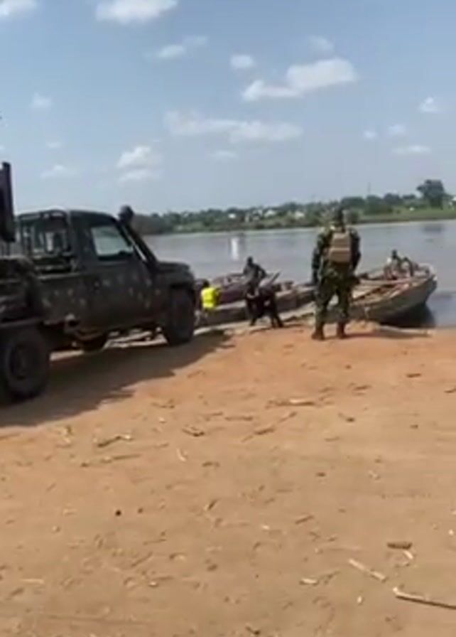 riverbank scene with several individuals dressed in military uniforms, accompanied by a truck. The truck is equipped with military-style modifications, including a mounted machine gun and additional protective gear. Some of the individuals are standing near the truck, while others are near wooden boats on the river. The landscape consists of a sandy bank leading to a river, and the sky is clear with scattered clouds. Some buildings and trees are visible on the opposite side of the river.