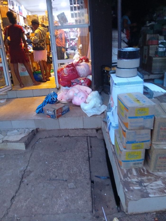 A street scene displays a shop entrance with goods spilling onto the step. A woman in red stands inside the doorway near another in a pink skirt. Stuffed animals and packaged items are stacked on the step. To the right, boxes are piled high on a platform, next to a dark vertical void. The ground in the foreground is concrete and uneven.