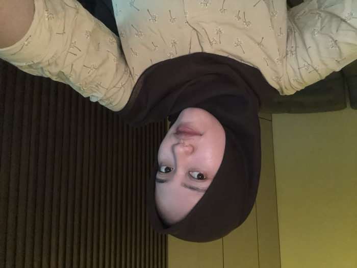 An indoor close-up photograph depicts a single female subject, estimated to be a young adult, centered in the frame. She is wearing a dark brown hijab and a light yellowish-beige long-sleeved top adorned with a subtle white floral or plant pattern. The subject has fair skin and a clear complexion, with her face illuminated, possibly by a front-facing light source. She looks directly at the camera with a neutral to slightly smiling expression. The background on the left features a plain wall, possibly painted a light olive or yellow-green hue, with a dark-colored sofa or seating furniture partially visible. The background on the right consists of a dark brown wall paneling with distinct vertical slats. The specific location within Gadingrejo, Indonesia, is not discernible from the visual evidence. The image appears to be a selfie due to the framing and perspective.