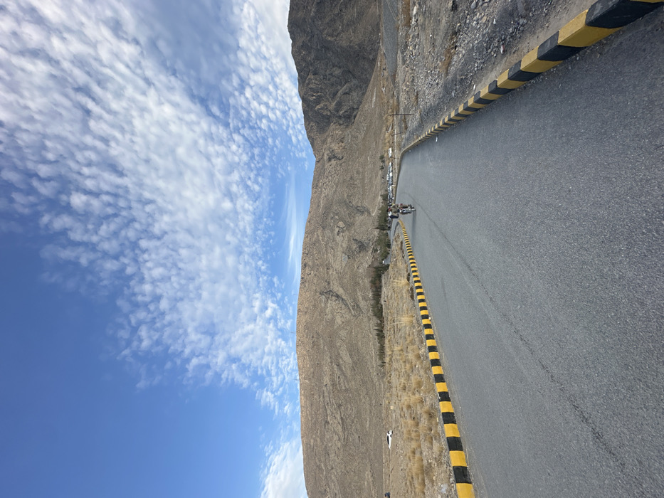 The image displays an outdoor scene in a semi-arid, mountainous region, identified as Quetta City Tehsil, Pakistan. A two-lane asphalt road, gray in color, recedes into the distance, gently curving right. Both edges of the road are delineated by concrete curbs painted with alternating yellow and black stripes. To the left of the road, a expanse of dry, tan-colored ground with sparse, withered vegetation extends towards a large, light brown mountain range in the background. A white vehicle is parked approximately 50 meters from the road on this side. A small cluster of green trees is visible further back. To the right of the road, the terrain is rocky and uneven, also featuring dry vegetation. A darker, more rugged mountain range forms the background on this side. Two individuals are observed riding a single motorcycle on the paved road, traveling away from the camera. The driver is in the front, with a passenger seated behind. Their clothing is not discernible. In the mid-ground on the left, a gathering of multiple individuals and several parked vehicles are visible. The sky is bright blue, featuring a band of numerous small, distinct white cumulus or altocumulus clouds stretching horizontally across the upper portion of the frame, positioned above the mountain peaks.