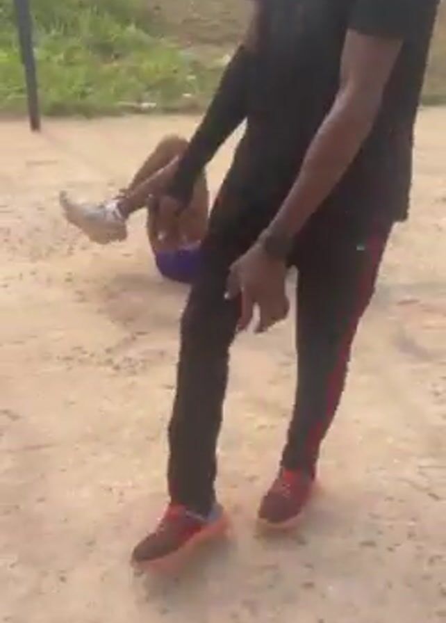 A man in black pants with a red stripe, a black shirt, and red shoes, stands on a sandy court. He is holding a worn basketball. In the background, a man is doing crunches on the ground. Behind them is a basketball hoop. The man with the ball then turns and looks out at the basketball court and the surrounding foliage and trees.