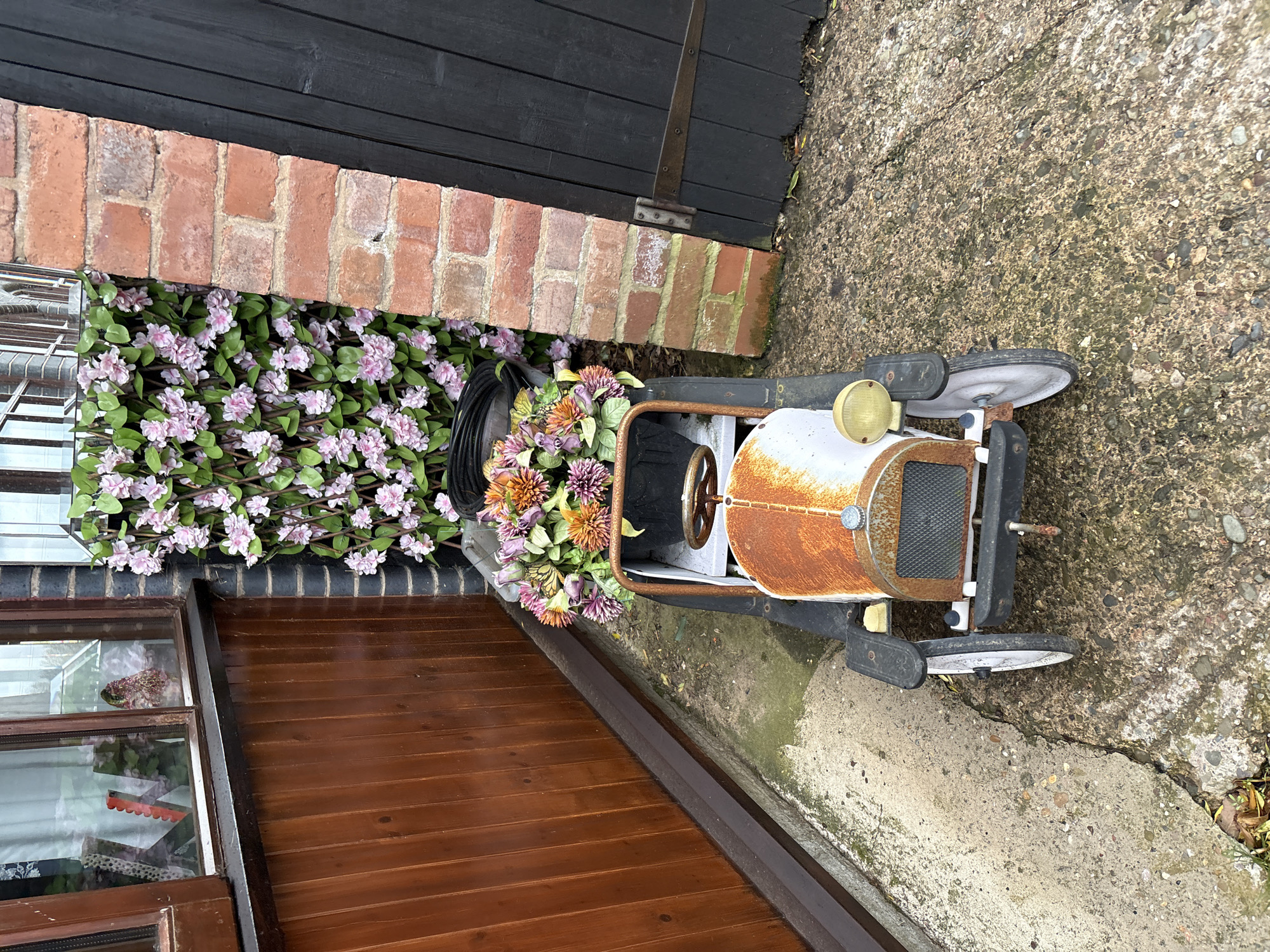 A rusty, antique-style pedal car, predominantly dark grey with a heavily rusted cream-colored hood and grille, is positioned on a worn concrete and aggregate path in Pulverbatch, United Kingdom. The car features a visible steering wheel, four light grey wheels, and a single yellow headlamp on its front right. Its interior is occupied by a black pot containing a vibrant bouquet of artificial flowers in shades of orange, purple, and green. To the left, a building wall is visible, consisting of vertical dark brown wooden planks with a horizontal trim board at the base. Above the planks, a window with a dark brown frame reflects an internal space, showing faint objects and white curtains. The ground immediately adjacent to this wall is a discolored concrete path with moss growth. To the right, a section of a reddish-orange brick wall with white mortar rises vertically. Adjacent to this brick wall on its right is a black wooden door or gate, secured with visible horizontal metal strap hinges. Behind the pedal car and between the building and brick wall, a green trellis with numerous artificial pink flowers is vertically mounted. A coiled black hose or cable is partially visible at the base of this floral screen. The ground on the right is a coarser aggregate surface, also showing discoloration. No people are present.