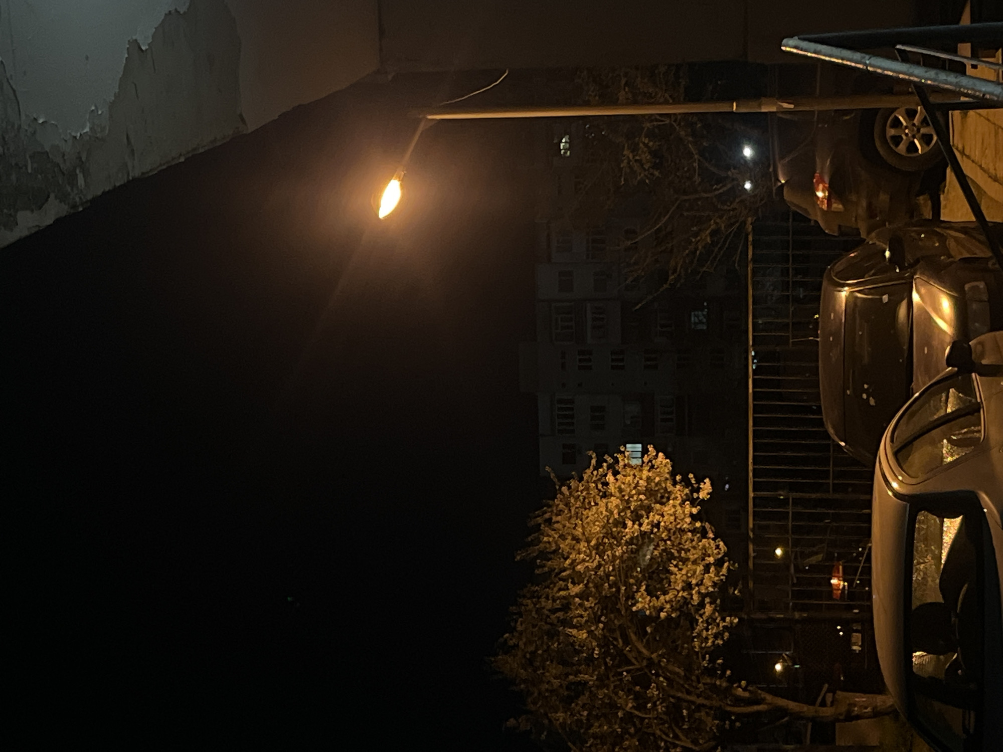 The scene depicts an urban residential area in Varna, Bulgaria, at night. The foreground features the rear section of a light-colored sedan, likely silver or light grey, parked facing left. Behind it, a darker sedan or hatchback is visible, and further back, a dark SUV or crossover is parked, facing right, with a single red tail light illuminated. A dark metal fence or gate runs horizontally across the mid-ground. To the left, a tree with dense, light-colored foliage, possibly in bloom, is brightly illuminated by an artificial light source. Another tree with mostly bare branches is visible further to the right. Dominating the mid-ground is a tall street lamp emitting a bright amber light, positioned right of center. In the upper right corner, a section of a concrete architectural element, possibly an overhang or ceiling, exhibits significant peeling paint and exposed concrete, suggesting deterioration. A metal handrail or railing is partially visible in the lower right corner, adjacent to a vertical support structure. In the background, a large, multi-story residential building, an apartment block with numerous windows, is visible. Several windows show internal illumination. The sky is dark, indicating nighttime conditions. No individuals, direct actions, or interactions are discernible in the image.