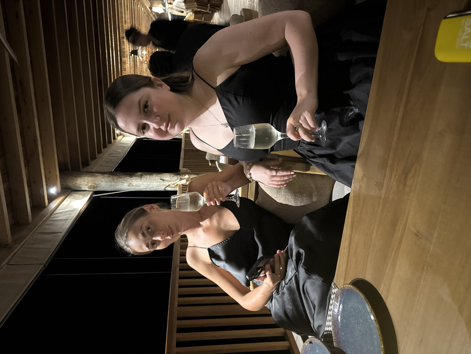 Two women in black dresses sit at a wooden table, each holding a glass of white wine. The woman in the foreground wears a satin dress with thin straps, while the woman behind her has a dress with thicker straps and a necklace. Plates are stacked on the table, and a yellow container is visible. The setting appears to be an outdoor restaurant or lounge, with dark surroundings and wooden beams overhead.