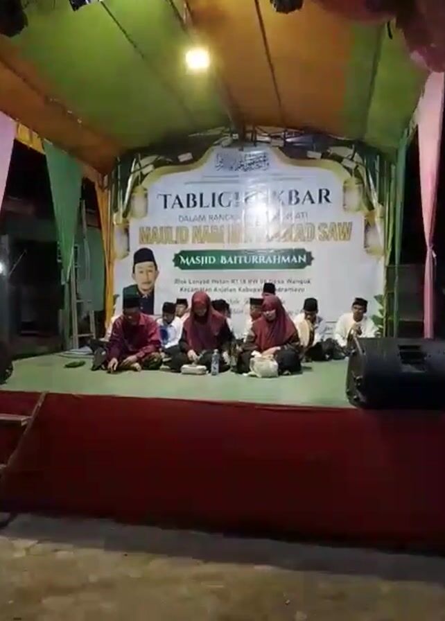 A long shot depicts a group of people seated on a raised stage during what appears to be a public event. There are seven individuals visible, including both men and women, all wearing traditional or formal attire, some with head coverings. They sit cross-legged, facing forward, and seem to be engaged in some form of musical performance or religious ceremony as they hold and manipulate musical instruments. The stage is decorated with a red front panel and draped with green, yellow, and pink fabrics around the edges. Behind the group is a backdrop banner that reads "TABLIGH AKBAR" and "MAULID NABI MUHAMMAD SAW," suggesting the event is related to Islamic religious observances. The banner also mentions "MASJID BAITURRAHMAN," indicating a mosque association. A portrait of a person is visible on the backdrop. Speakers are placed on either side of the stage, and a ladder is seen near the stage's left side. The event seems to be taking place outdoors at night, judging by the lighting and the partially visible surroundings.