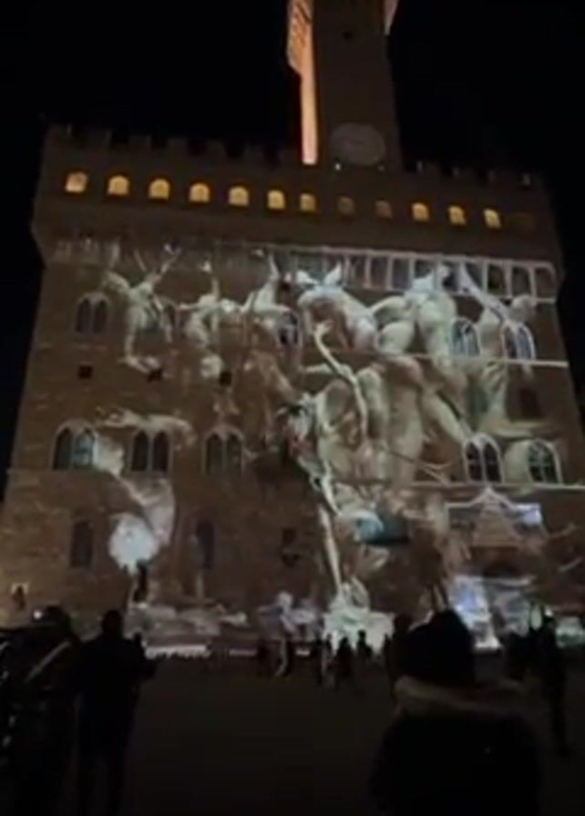 At night, a tall, stone building with a clock tower is illuminated with a projection of a Renaissance-style painting. The building has crenellations and arched windows. The projection features multiple figures in a chaotic scene. Several people stand in the foreground observing the light show. The scene is dark and moody, with the light from the projection contrasting against the night sky.