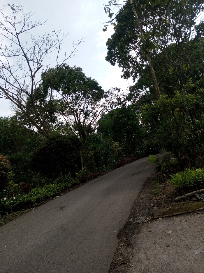 A winding asphalt road stretches uphill, disappearing into dense green foliage. Trees line both sides of the road, some bare-branched and reaching towards the cloudy sky. Lush vegetation and shrubbery fill the foreground, with some logs visible near the road's edge. The angle is slightly skewed, providing a ground-level view of the road and the surrounding natural environment.