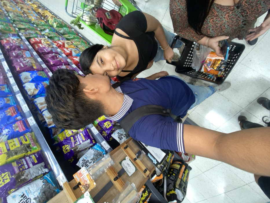 - "A couple stands close in a grocery store aisle with shelves of pet food" by FM-SP1IA3, licensed under CC BY 4.0
