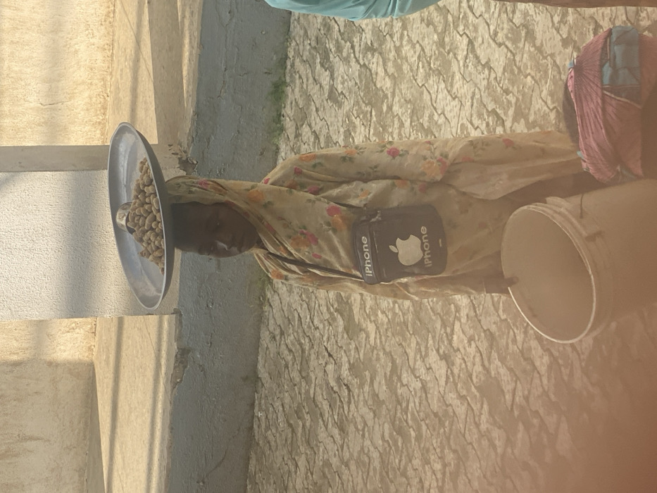 An individual stands outdoors on a light-colored interlocking brick pavement in a city in Unknown, Nigeria. The person wears a long, light-colored garment with a floral pattern and a matching head covering. They balance a large, metallic, shallow circular tray on their head, containing a mound of ovular, light brown objects (consistent with groundnuts/peanuts) and a small metallic cup. A black shoulder bag with a white Apple logo and "iPhone" text is worn across their torso. In their left hand, they hold a white plastic bucket. A bundle of pink and blue fabric lies on the ground to their right. The background features a light-colored plastered wall, partially shadowed. A portion of a second person in light blue clothing is visible on the far right.