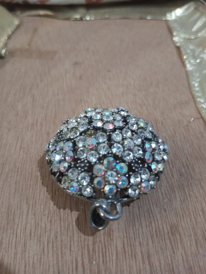 A dome-shaped piece of costume jewelry, heavily encrusted with numerous small, circular, faceted rhinestones, is depicted centrally. Most rhinestones are clear, while some exhibit an iridescent, multi-color shimmer. The base metal of the jewelry appears dark-toned, possibly antique silver or blackened. A metal loop, or bail, for suspension is visible at the bottom of the object. The jewelry rests on a light brown wooden surface displaying a distinct grain pattern. In the blurred background, golden or light-colored fabric or material is partially visible. No individuals, actions, or interactions are visible. The specific location within the city of Chandragiri, Nepal, cannot be determined from the visual information provided in the image.