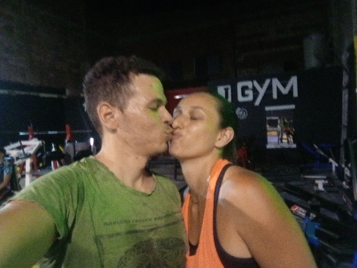 Two individuals are kissing indoors, appearing sweaty. The man wears a green t-shirt. The woman wears an orange and black tank top. A gym setting surrounds them, with exercise equipment visible and a large sign reading "GYM" displayed in the background. The lighting is dim and somewhat uneven.
