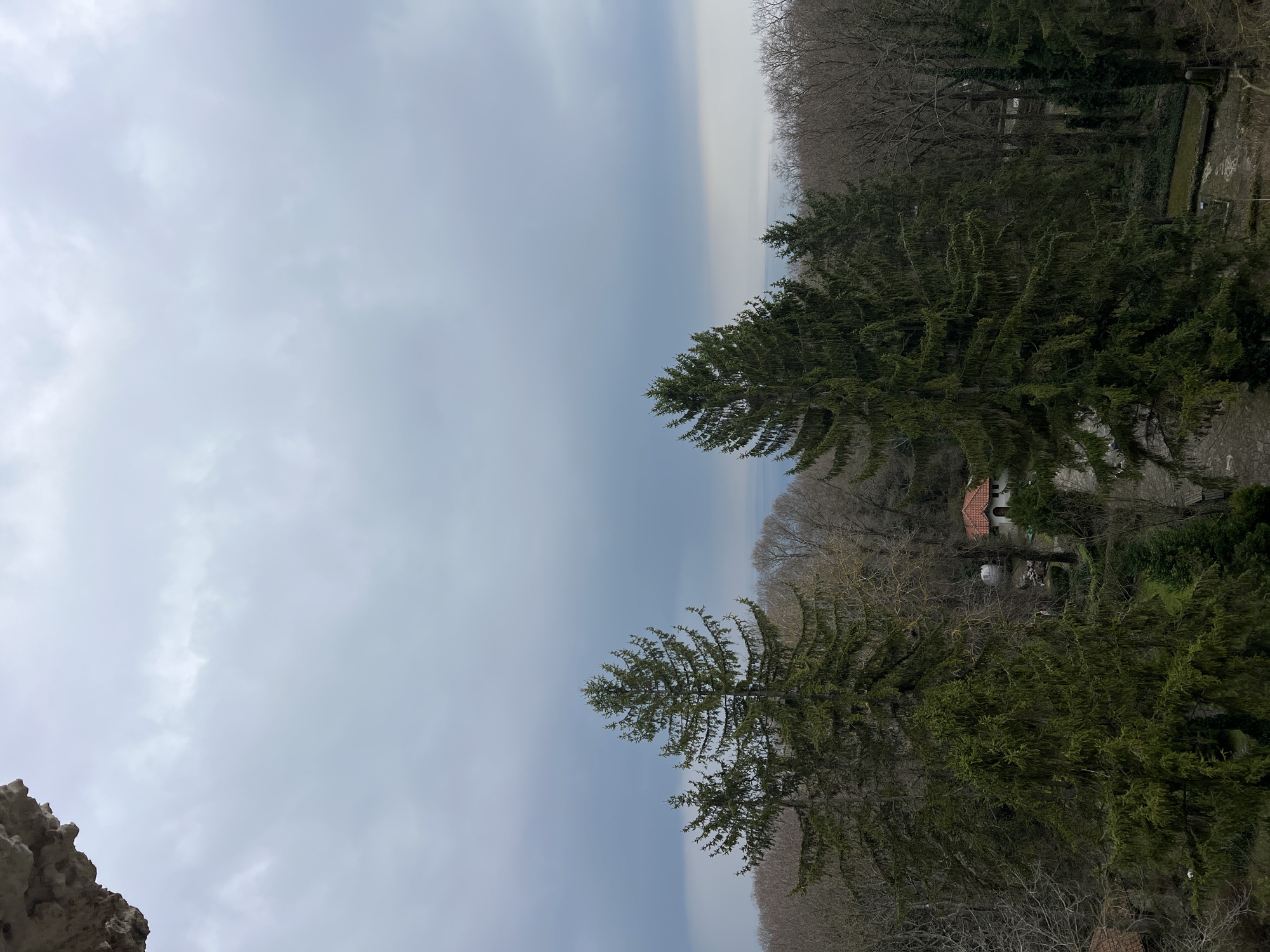 view from a high vantage point, likely a structure like a tower or high ground, in Varna, Bulgaria. The scene features a cloudy sky taking up approximately half of the frame. Below the sky, there's a mix of evergreen trees and deciduous trees, some of which are bare suggesting it might be late fall or winter. Among the trees, a building with a red tile roof is visible. In the foreground, to the far left, there's a part of a stone structure, possibly a wall or a part of a ruin. The horizon is somewhat hazy. The image is taken from an elevated position, offering a panoramic view of the landscape and partially obscures the details of the environment.