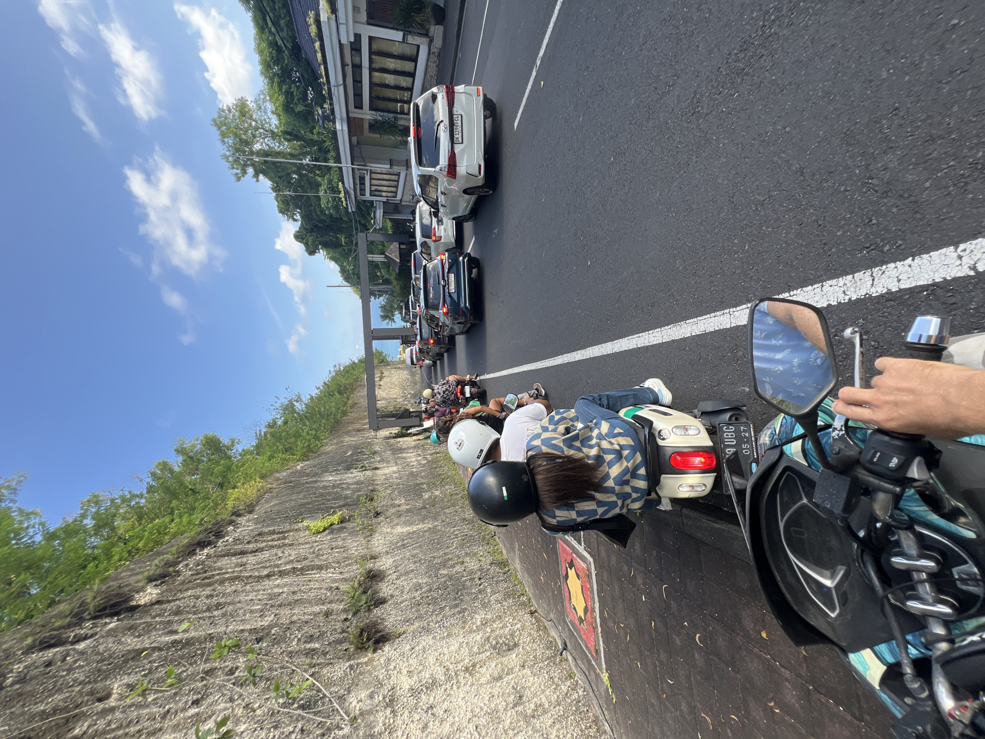Ungasan, Indonesia: A traffic jam is seen on a road with a high concrete wall on one side covered in vegetation. Several scooters are lined up on the side of the road, including the one from which the picture is taken. The scooter driver's hand is visible, holding the handlebar. The back of another scooter rider is seen in front, wearing a blue and white patterned shirt, blue jeans, and white sneakers. They have a black helmet. A line of cars is stopped on the road. The sky is blue with clouds.