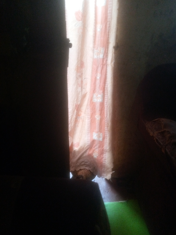 The image depicts an interior scene in Ngong ward, Kenya, characterized by dim lighting. A vertical, light-colored curtain, featuring peach or faded pink hues with white patterned stripes, occupies the central portion of the frame. The curtain's bottom edge is frayed. Sunlight or an external light source illuminates the curtain from behind, casting a bright vertical strip. Partially visible at the base of the curtain, a light-brown fowl, consistent with a chicken, is positioned facing left. The left side of the image is dominated by a dark, undefined structure, possibly a door frame or wall. On the right, dark upholstered furniture is visible, with a textured, lighter-colored fabric resting on it. A bright green mat or rug is present on the floor in the lower right quadrant, partially illuminated. No human figures are present.
