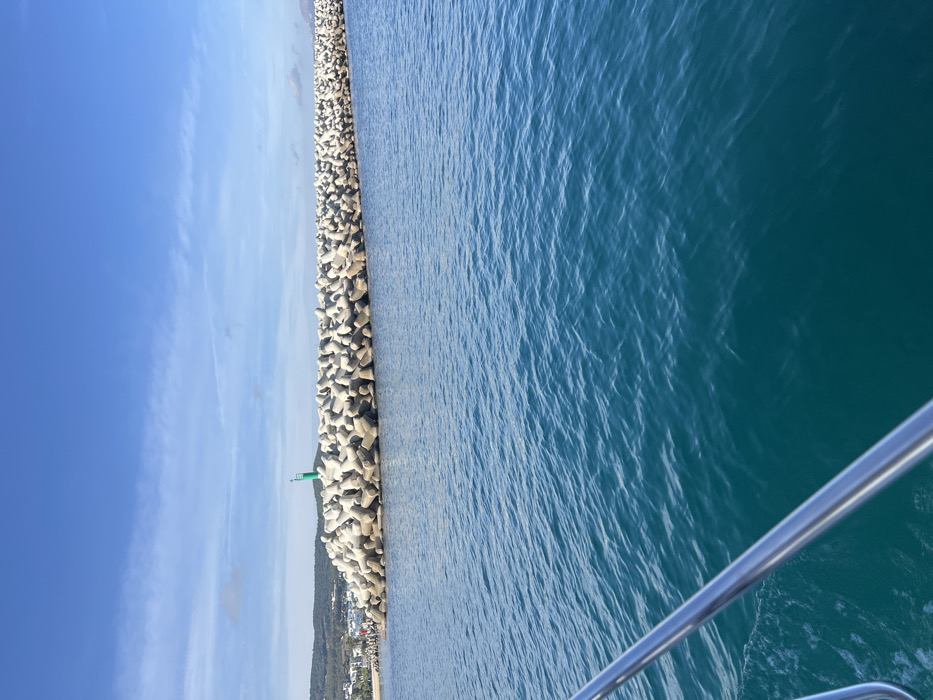 The image presents a marine environment in M'diq, Morocco, under a clear sky with sparse cirrus clouds