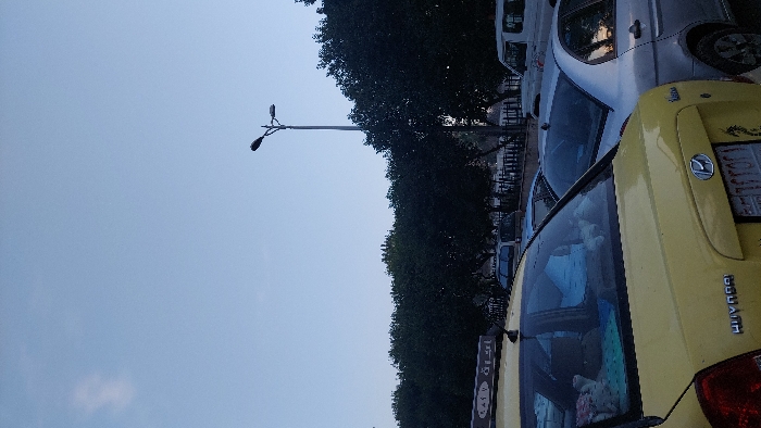 Cars are parked along a street with trees lining the side. The sky is overcast. A tall street light stands prominently. The cars include a yellow Hyundai and a silver vehicle. The scene conveys a quiet, urban atmosphere.