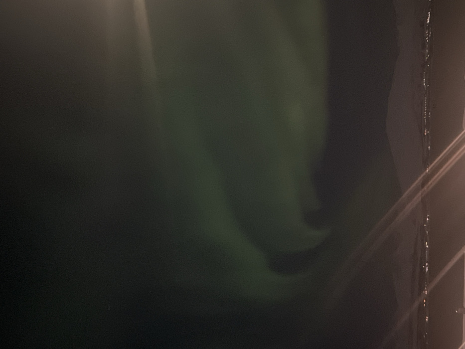 The image depicts a panoramic nighttime scene in Tromsø, Norway, characterized by an overhead display of the Aurora Borealis. The upper two-thirds of the frame present a dark sky where undulating bands of green light, indicative of the aurora, are prominently visible. A faint, diffuse light source is discernible in the upper right quadrant. The horizon features a dark, irregular mountain range, partially covered with snow, which descends into a body of water, likely a fjord. Along the distant shoreline of this water body, a scattered array of individual artificial lights denotes an urban settlement. Two distinct, diagonal streaks of light, consistent with internal reflections or external glare through a window, traverse the lower portion of the image. No human figures or discernible actions are present within the scene.