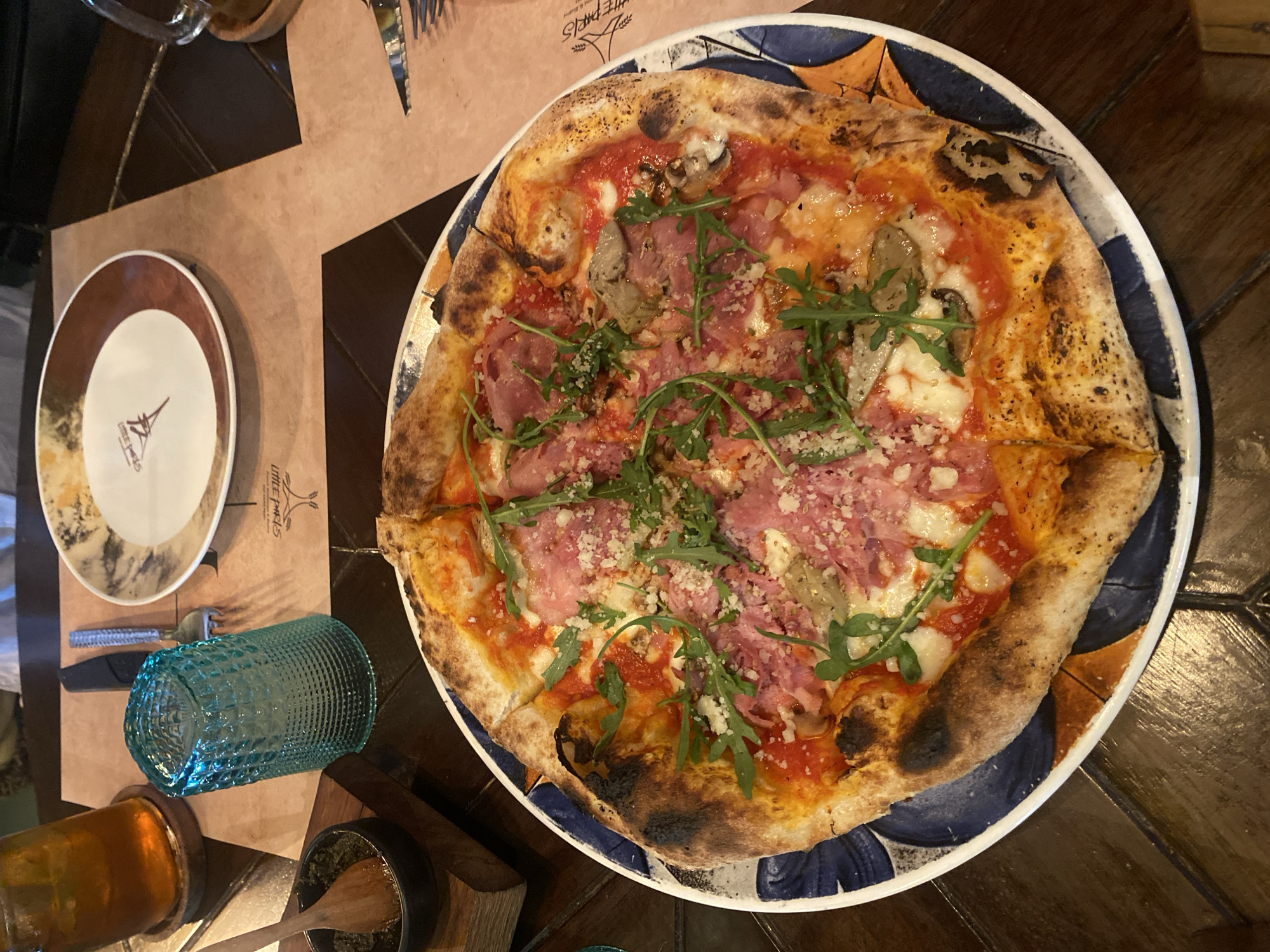 A pizza is presented on a blue-and-orange patterned plate on a dark wooden table in Choeng Thale, Thailand. The pizza has a tomato base, mozzarella, ham, mushrooms, arugula, and grated cheese. A placemat to the left holds a small plate with the words "Little Paris" on it, a knife and fork, and a textured blue glass. Also on the table are a container of honey, a wooden utensil, and a small bowl containing a green sauce. The lighting is subdued, creating a warm, inviting atmosphere.