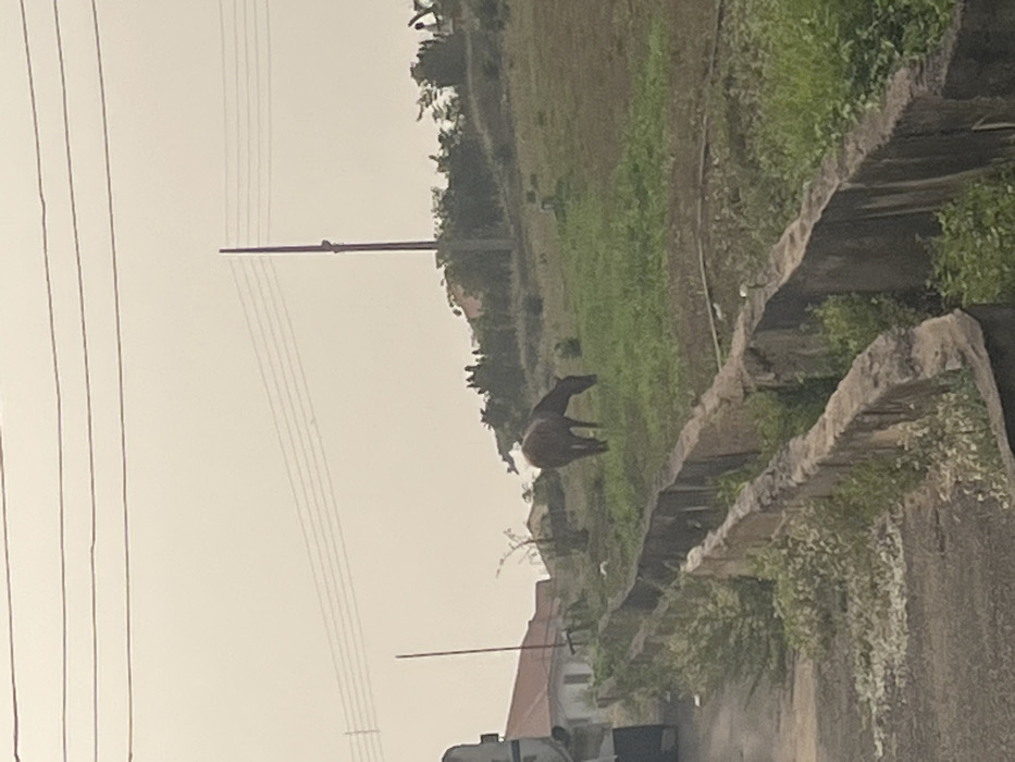 A landscape view shows a brown horse grazing on a green hillside. Power lines stretch across the sky. A concrete structure with vegetation growth is visible on the right. In the foreground, the top of a white vehicle appears. Buildings are situated at the bottom of the hill. The scene is shot on an overcast day with a muted color palette.