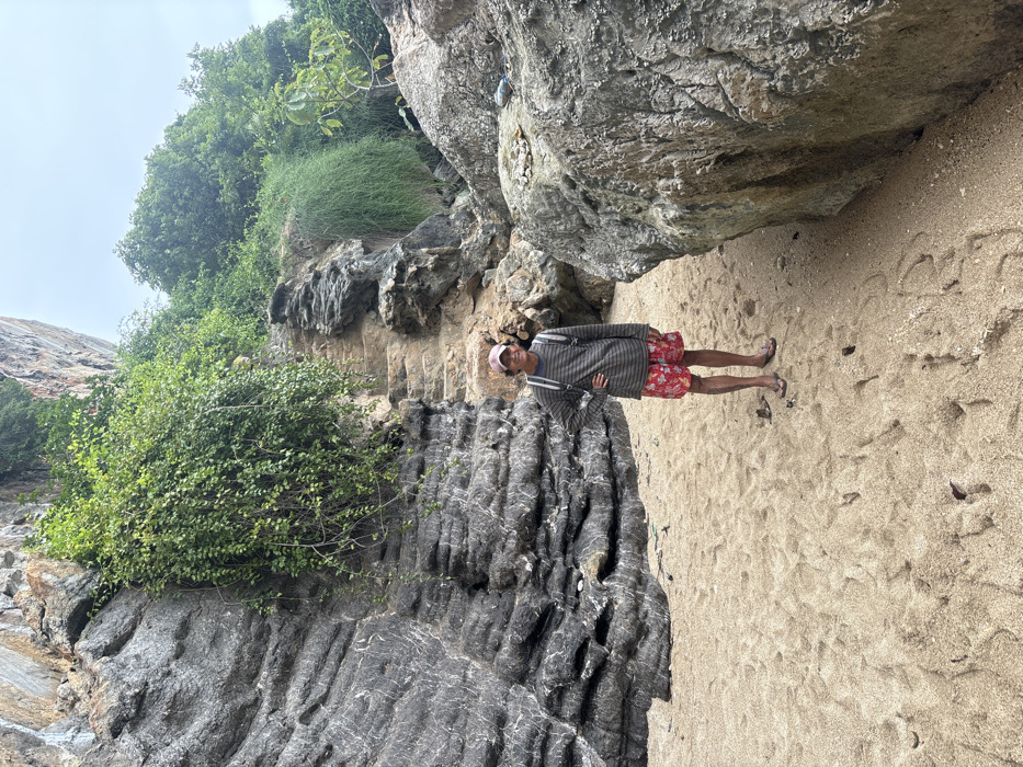 An adult male stands on a sandy beach or cove within Ao Nang, Krabi province, Thailand