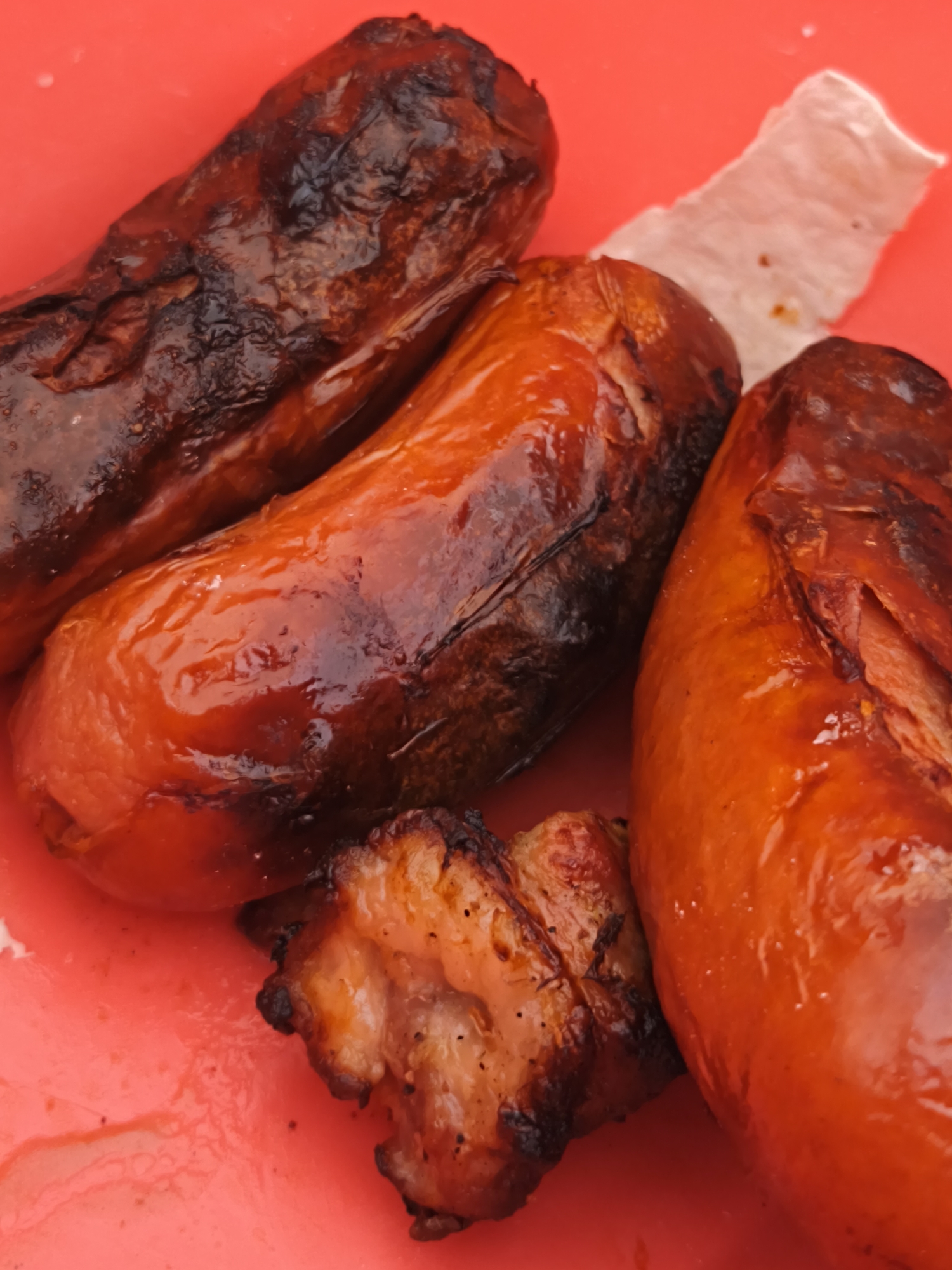 three sausages, one piece of cooked meat and a small square piece of what seems to be an onion. The sausages and the piece of meat are on a red surface. The sausage at the top is burnt. The location is not discernible from the image.