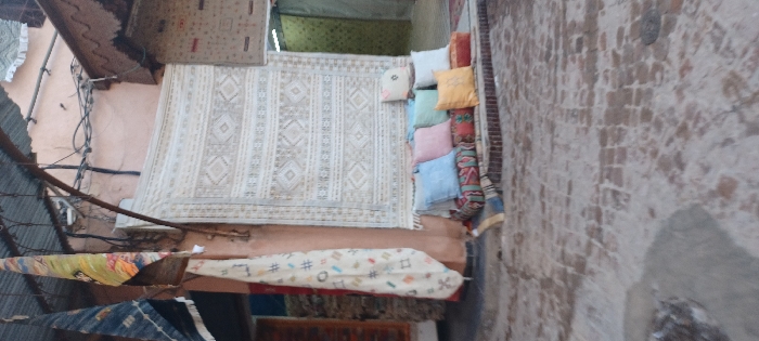 The image displays a textile stall within a souk in Marrakesh, Morocco