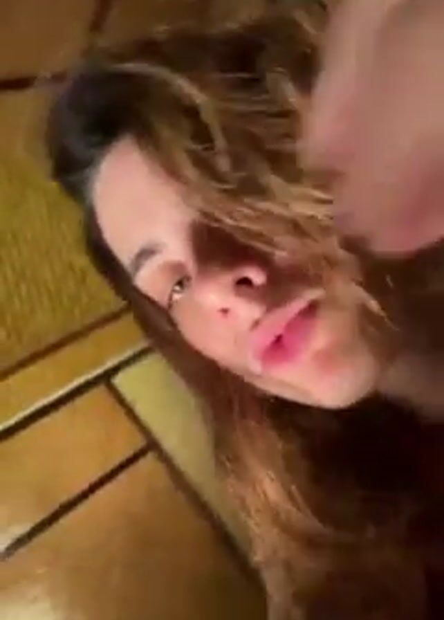 A woman with curly brown hair is lying on her back on a floor that appears to be covered in a textured material. She is wearing a light-colored tank top and beige pants. She initially has her hand near her mouth and then moves it away. The camera angle is above her, looking down, and the video pans to show her full body. A portion of a maroon chair and dark-colored shoes are visible in the background.