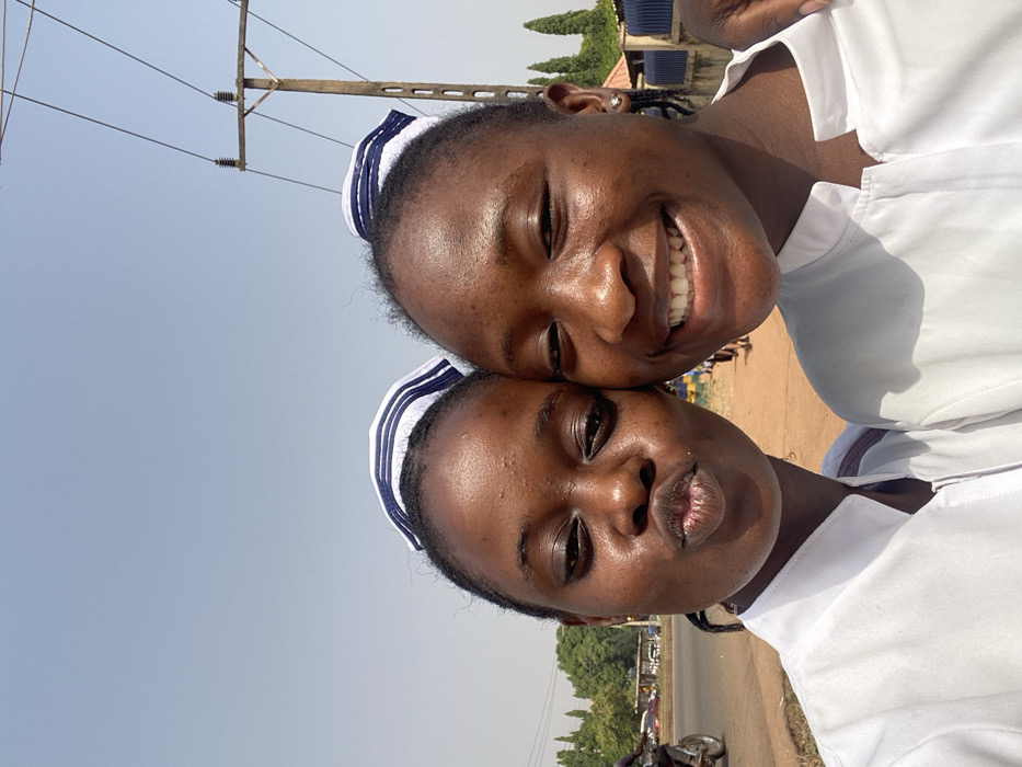 This image is a close-up outdoor selfie featuring two young Black women in Kakuri Gwari, Nigeria, captured on a sunny day