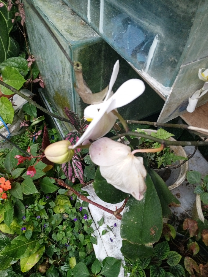 The image presents a detailed view of a lush plant environment located in Khe Sanh Commune, Vietnam. The central subject is an orchid plant with a primary focus on two white flowers and one green bud. One orchid flower is fully open, positioned to the upper left, displaying distinct white petals and a faint yellow center. Another orchid flower, appearing partially wilted, hangs downwards and to the right, showing a pale white color with subtle pinkish discoloration. A prominent, light-green, teardrop-shaped bud is situated to the left of the open flower. All three are attached to a multi-branched, light-brown stem. In the upper portion of the background, a translucent, greenish-tinted glass or acrylic structure, possibly an abandoned aquarium or a planter box, is visible. Its surfaces appear weathered and stained with dirt and mineral deposits, suggesting prolonged exposure to the elements. A dark, slender, horizontal element, potentially a metal rod or plant support, runs behind the glass. The lower and mid-sections of the image are densely filled with various green plants. These include species with variegated leaves featuring pink and green patterns, smaller plants bearing delicate purple flowers, and others with vibrant orange-red blossoms. A white plastic pot containing small green ferns is partially visible on the right side. The ground beneath the foliage appears to be a mix of soil and organic debris. No human or animal subjects are present, and no direct actions or interactions are depicted beyond the static botanical display.