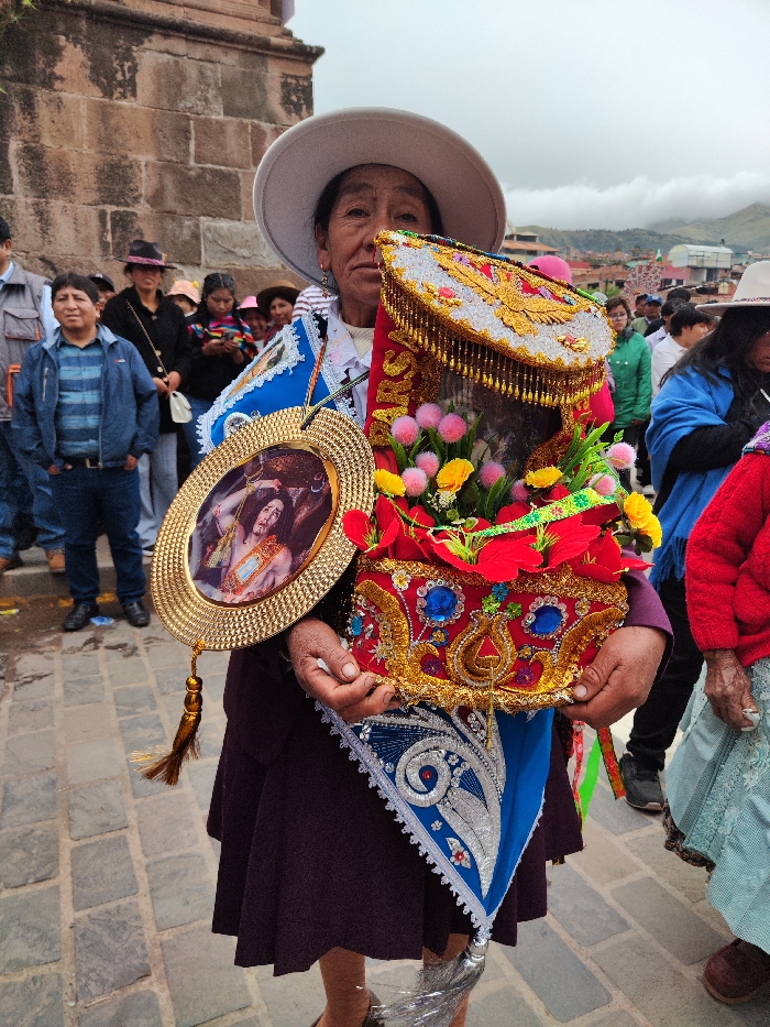 A woman in traditional Andean clothing holds religious items. She wears a wide-brimmed white hat and a dark purple dress. She carries a framed oval portrait depicting a religious figure, and a decorated, tiered, shrine-like structure adorned with flowers, jewels, and gold trim. A blue and white embroidered shawl is also visible. The scene appears to be outdoors, in a crowded area with stone paving, with other people in the background. Mountains and a cloudy sky are visible in the distance.
