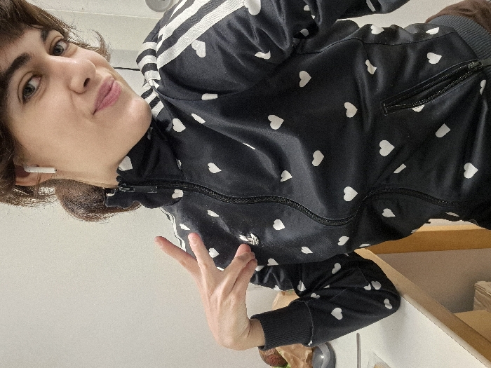 A young adult female is depicted in a close-up, chest-up indoor shot, positioned to the right of the frame and looking directly at the camera with a slight smile. She has dark, curly hair with bangs, styled in a low ponytail, and wears a white AirPod in her right ear. Her left hand is raised, forming a 'peace' sign with the index and middle fingers extended. She is wearing a black Adidas track jacket featuring white stripes on the sleeves, a full-length front zipper, and an all-over pattern of small white hearts. The Adidas trefoil logo is visible on the left chest. A zippered pocket is visible on the lower right side of the jacket. A brown garment is partially visible beneath the jacket's hem. The background consists of a plain, light-colored wall. A light-colored wooden desk or table surface is visible along the bottom and left edge of the frame, with a crumpled brown paper bag and a grey computer mouse partially visible on it. The image provides no visual indicators to confirm a location in Paris, France.