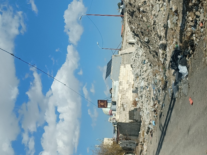 The image depicts a static urban scene in Al-Qadam Municipality, Syria, characterized by extensive demolition and accumulated rubble under a partly cloudy blue sky. In the foreground, a worn asphalt road occupies the lower left, leading into the midground. Adjacent to the road, on the lower edge, assorted refuse including black and white plastic bags and an orange-red item are visible. To the right, a large, uneven mound of grey concrete and building rubble dominates, extending into the midground and containing fragments of masonry, rebar, and debris. The midground features remnants of damaged structures. A partially intact building wall, constructed from light-colored stone or concrete blocks, exhibits signs of significant damage. Above this wall, a brown and white sign with Arabic script is mounted. Behind the sign, a light green dome is visible, possibly belonging to a religious structure or a water storage tank. Further right and slightly behind, a set of dark solar panels is installed on a flat, damaged rooftop. Overlapping the upper part of the scene, a thin black wire or cable with attached insulators stretches diagonally from the upper left towards the mid-right. Two modern-style streetlights with reddish-brown poles are positioned on the right side, one prominent and one partially obscured further back. In the distant background, less distinct structures and the tops of telecommunication antennas on a building are visible on the far left. No individuals, animals, or active interactions are present in the frame. The overall environment suggests a state of disrepair, demolition, or post-conflict damage.