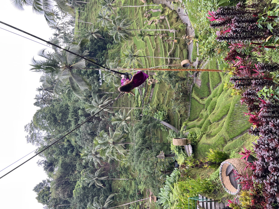 A person in a purple garment swings over lush green rice terraces, framed by tall coconut trees and dense foliage