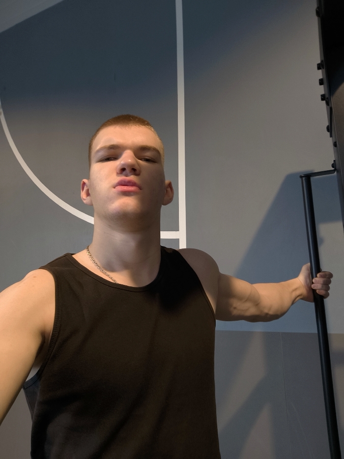 An indoor scene in Hœnheim, France, features a young, light-skinned male subject with a short, light-colored buzz cut, facing the camera with a neutral expression and slightly pouted lips. He is wearing a black tank top and a silver chain necklace. His right arm, appearing muscular, extends to the right side of the frame, holding a vertical black metal bar firmly with his right hand. The background consists of a plain gray wall marked with distinct white lines, including a prominent vertical line and a large curved arc, indicative of a gymnasium or sports court, possibly a basketball court.