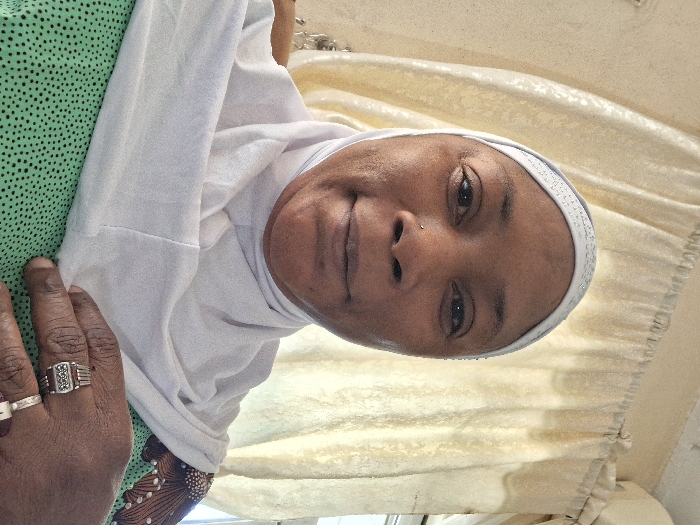 An indoor, medium shot photograph captures an adult individual, appearing female, with a dark skin tone, facing directly towards the camera. The subject wears a white hijab with a decorative band across the forehead, and a light green garment patterned with black polka dots. A portion of a patterned sleeve, featuring brown, orange, and white elements, is visible on the subject's right. The subject's right hand rests near the chest area, displaying two rings: a prominent rectangular ring with multiple dark elements on the ring finger, and a thinner band with a single reddish-purple stone on the pinky finger. A small metallic piercing is visible on the subject's right nostril. The background consists of light-colored, cream or beige curtains, gathered at the top, suggesting an interior setting. The location is an unspecified room within the city of Unknown, Unknown.
