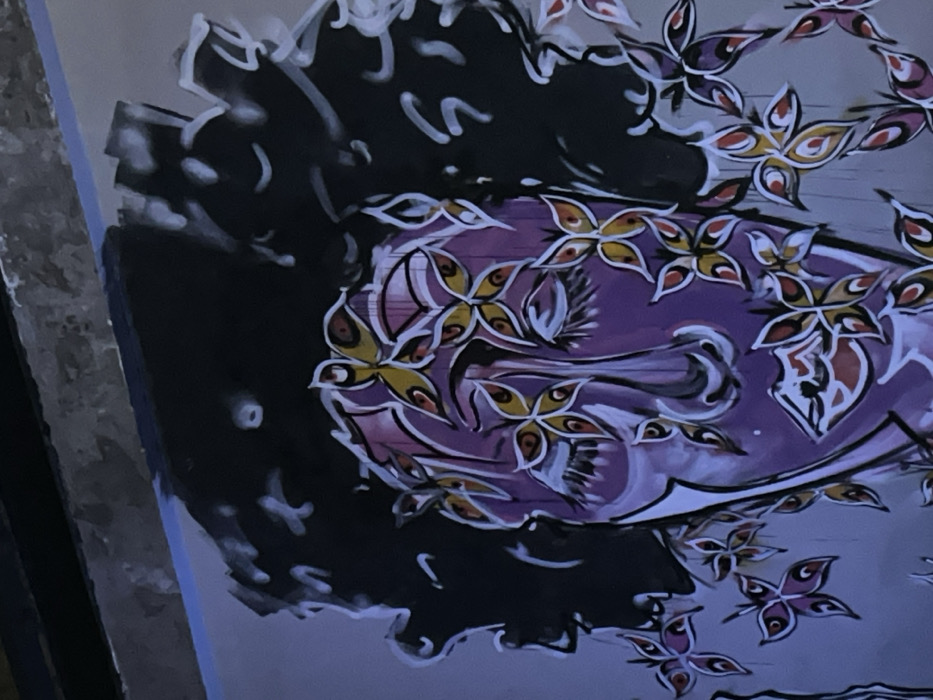 The image is a close-up shot of a mural painted on a wall. The mural depicts a woman's face with her eyes closed. Her hair is black and voluminous, and her skin is purple. The woman is surrounded by stylized flowers that have eyes in the center of them. The background is a light gray color. The image appears to be located in the Nairobi, Kenya, area, where the coordinates -1.261, 36.804 are located, near the Nairobi National Museum and the city's center. It's likely a street art piece, based on the style and location. The wall appears to be smooth and is made of concrete or a similar material. There are no other people or objects in the image. The overall mood of the image is one of mystery and introspection. The closed eyes and the stylized flowers with eyes suggest a sense of dreaming or being lost in thought.