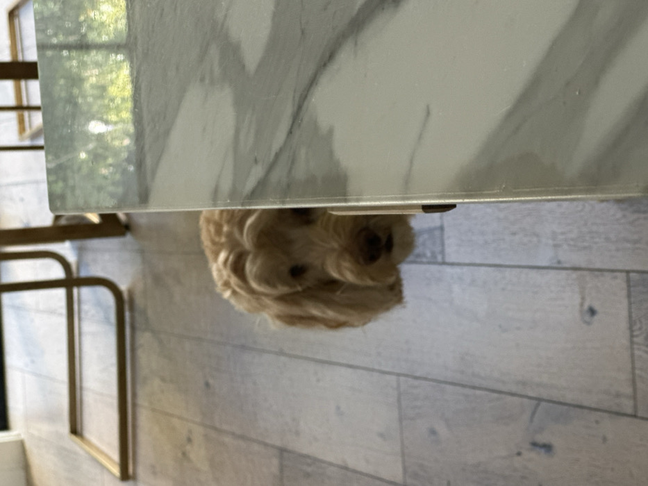 A fluffy, light-brown dog hides under a marble-topped table. The dog's face is visible, with dark eyes peeking out. The floor is light gray with subtle wood grain. Part of a gold-colored table leg is visible in the lower left corner. The marble table has gray veining patterns.