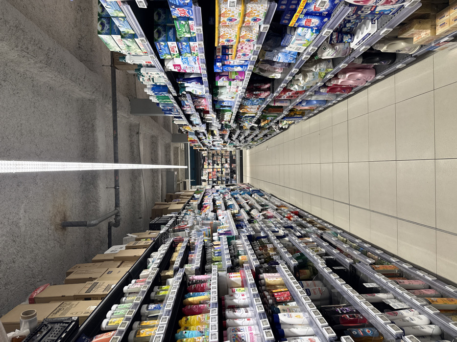 A brightly lit supermarket aisle stretches into the distance. Shelves are densely packed with diverse products, their colorful packaging creating a visual cacophony. Above, a bright, linear light source illuminates the aisle, contrasting with the rough texture of the ceiling. The floor is tiled. The perspective emphasizes the length and depth of the shopping aisle.