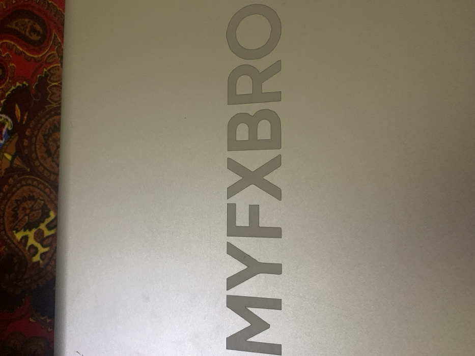 The image features the text "MYFXBRO" vertically aligned on a silver or light gray surface. The text is in a simple, sans-serif font and appears to be embossed or engraved into the surface. A small portion of a patterned fabric, possibly with paisley designs, is visible on the left side of the image, creating a contrast with the plain background. The lighting appears to be slightly diffused, giving the surface a smooth, matte appearance.